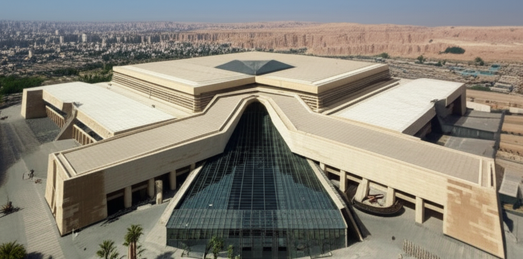 Architecturally, the complex features a contemporary design that incorporates desert-inspired geometry and materials, framing views toward the pyramids. Inside, the galleries are organized chronologically and thematically, with attention to accessibility, lighting, and interpretation to support both casual visitors and specialists.
